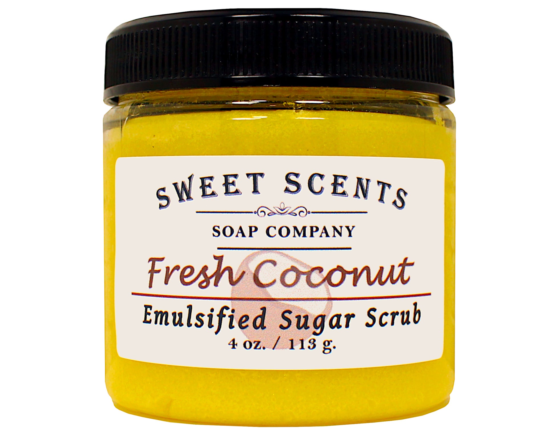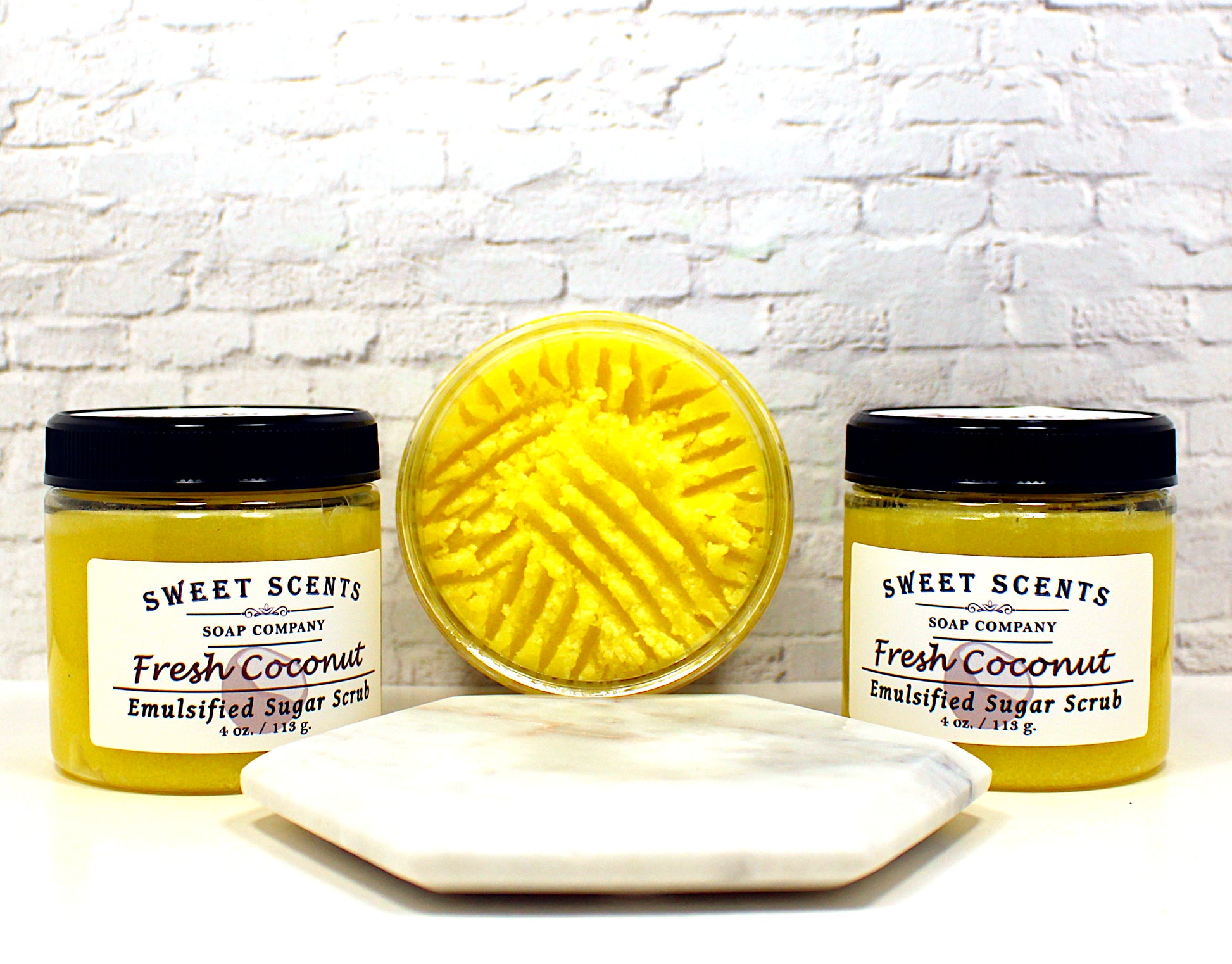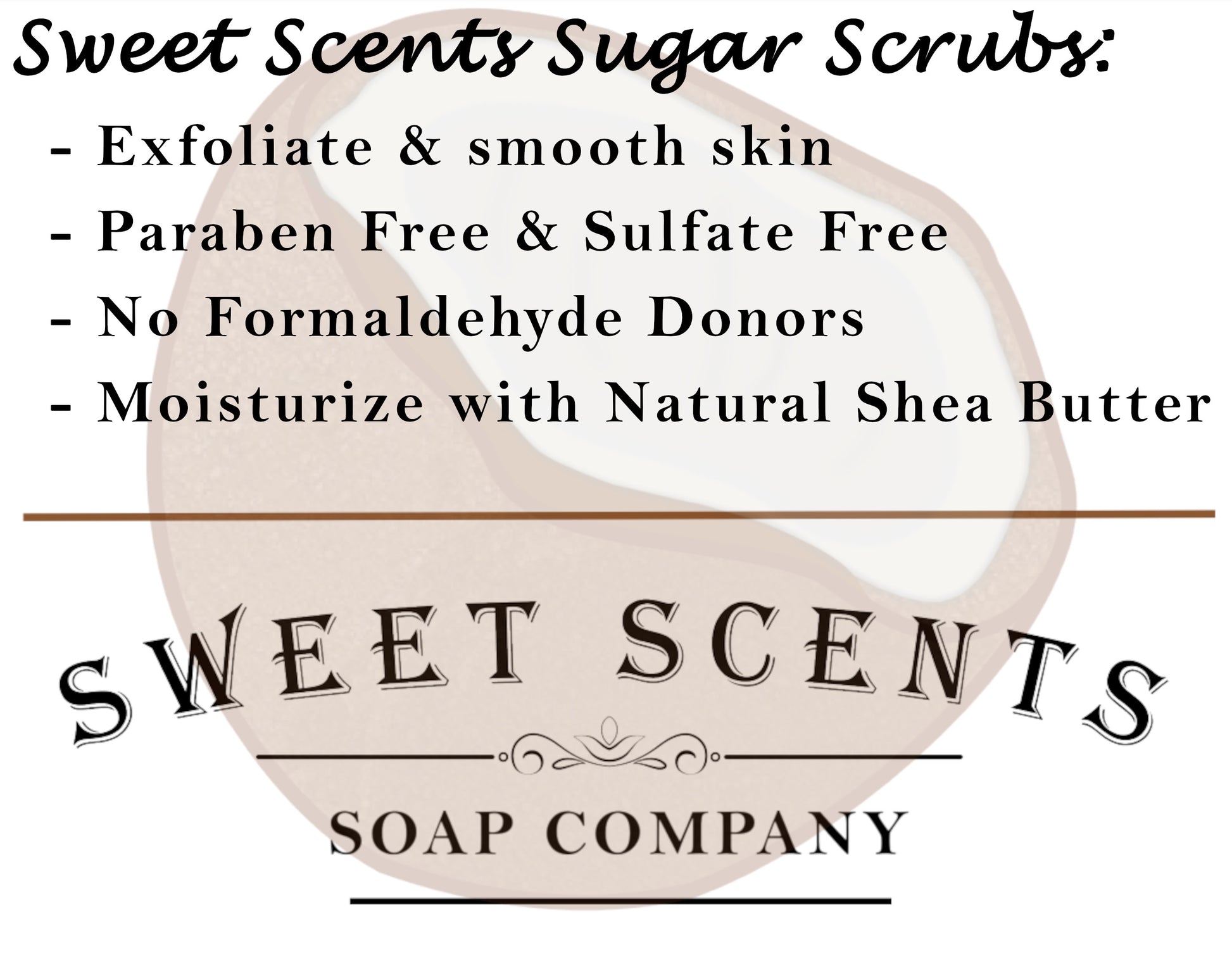 All our sugar scrubs are a sweet treat! They are exfoliating yet gentle. Our scrubs are emulsified. This holds the oils and the sugar together so there is no need to stir as needed with a traditional scrub.