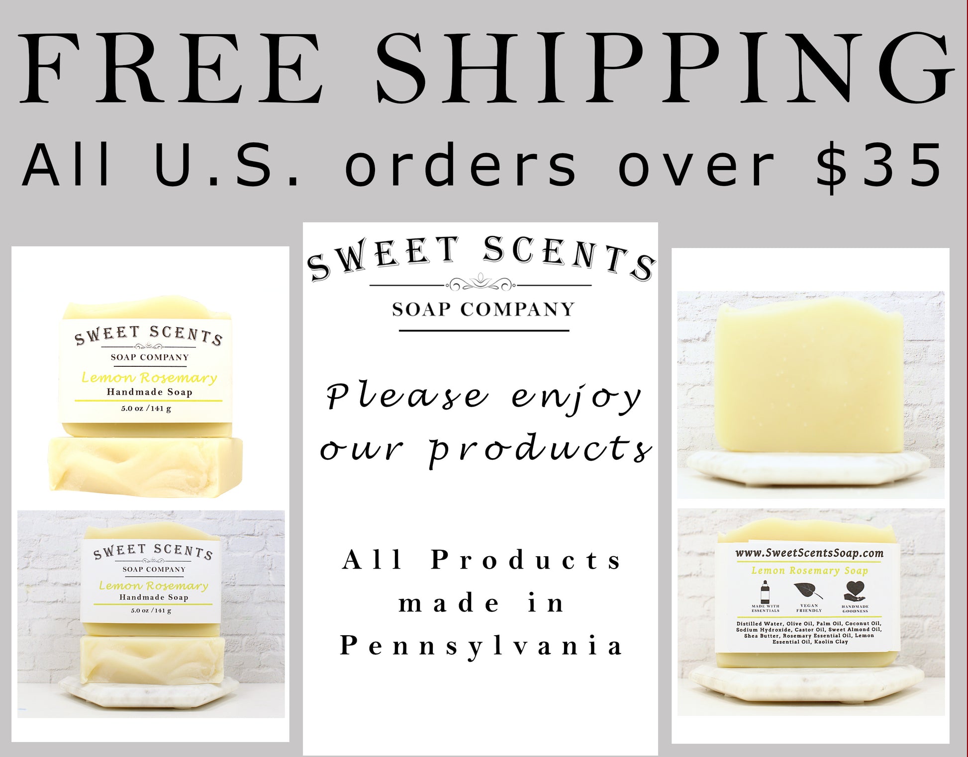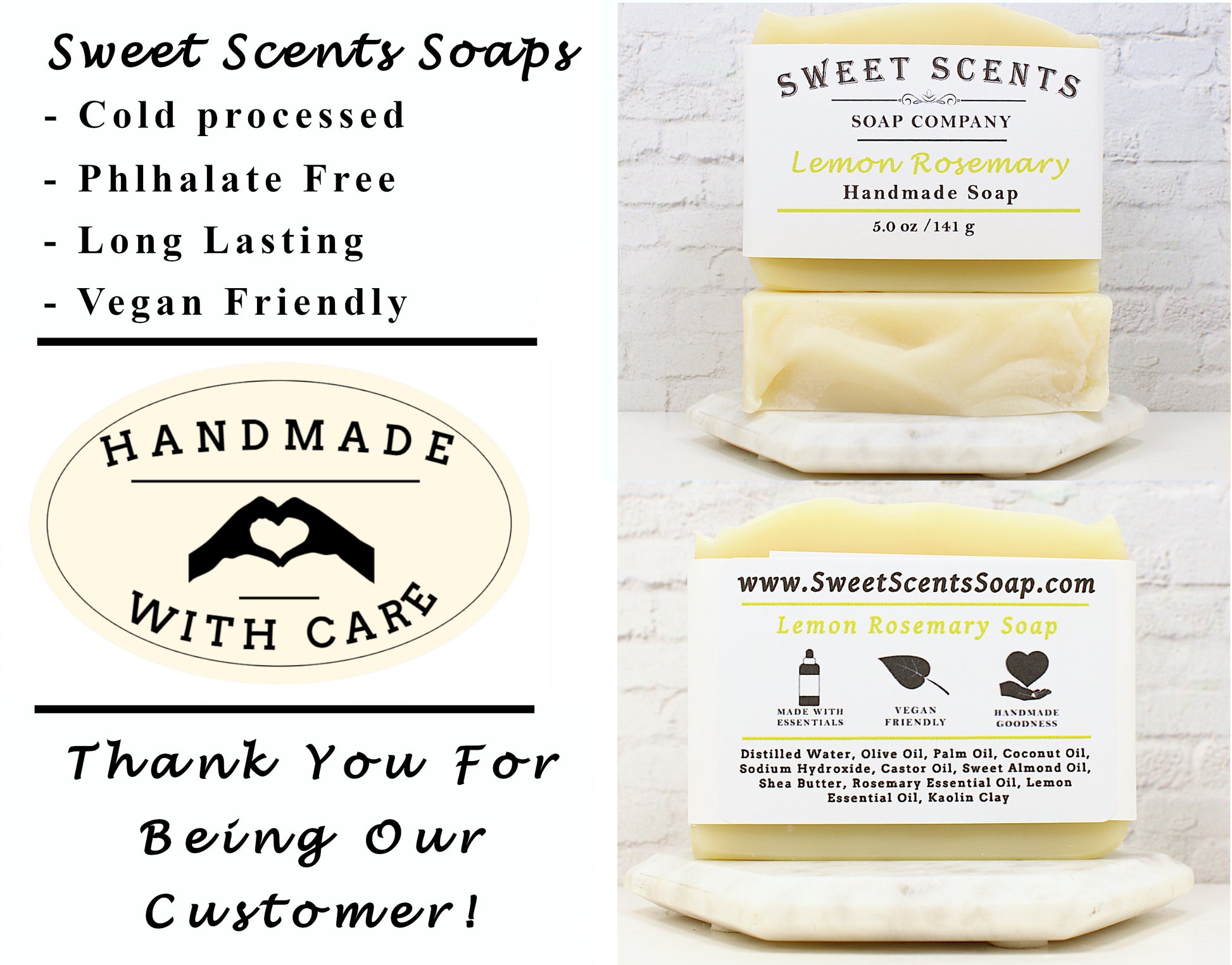 Our Lemon Rosemary soap bars are the perfect gift for anyone for any occasion or for your own use. Everybody uses soap! We use only the finest ingredients to create our bar soaps and we guarantee that you will enjoy these bars.